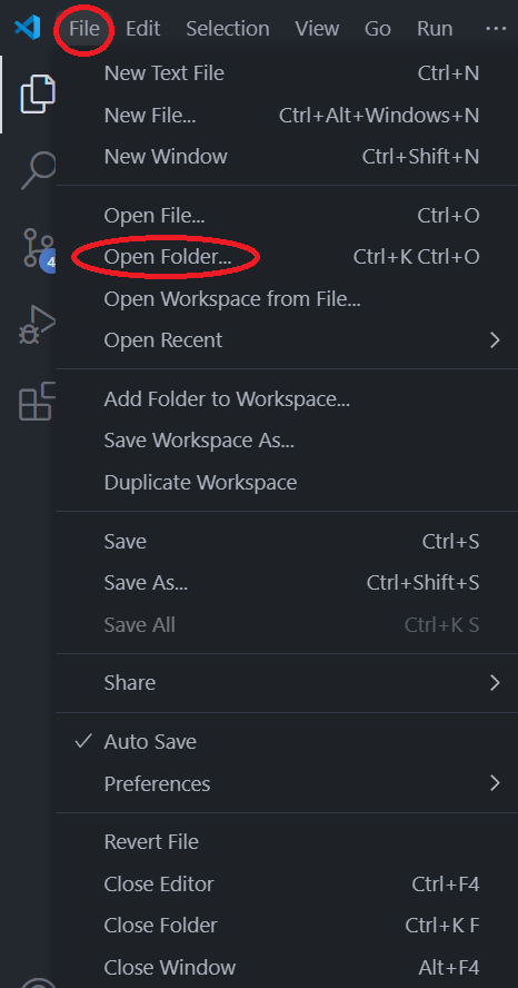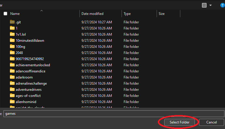 4: Go back to the files icon and press file>open folder..., then open the games folder that you downloaded.